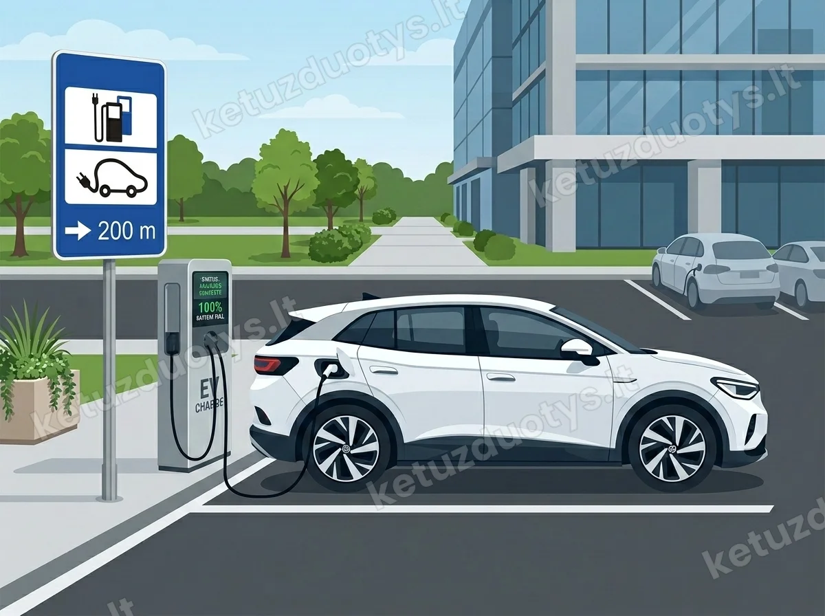 Ką privalo daryti elektromobilio vairuotojas, kai jo transporto priemonės įkrovimas yra baigtas, o kelio ženklai nenurodo kitaip?