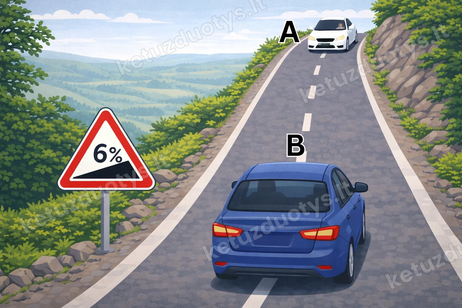 Siaurame kelio ruože, pažymėtame nuokalnės ženklu, dėl kliūties prasilenkti su priešais atvažiuojančia transporto priemone sunku. Automobilis A važiuoja nuokalne, automobilis B – įkalne. Kuris vairuotojas turi duoti kelią?