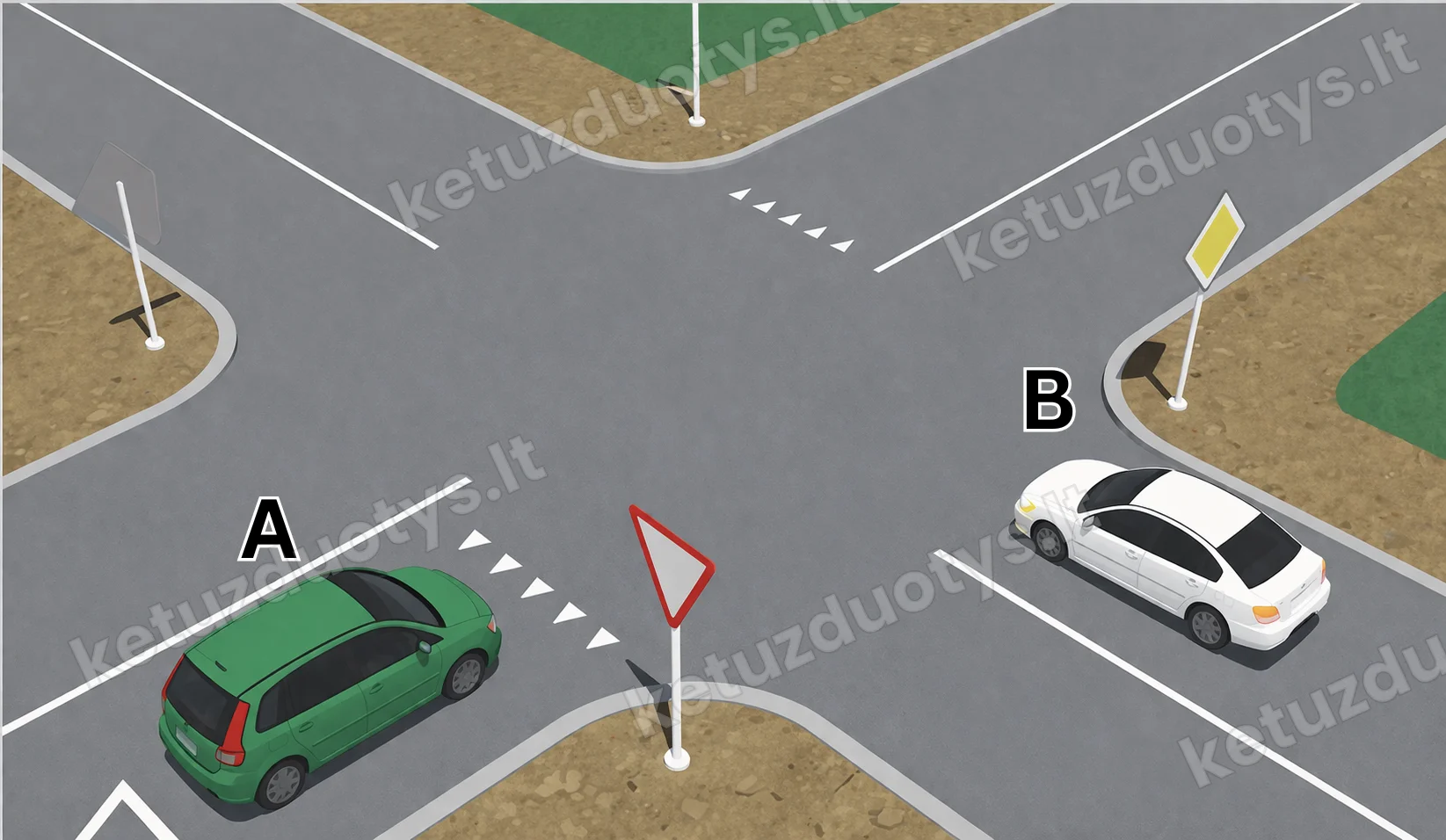 Jūs važiuojate automobiliu A. Artėjate prie sankryžos, kurioje pagrindinis kelias suka į dešinę. Jūs ketinate važiuoti tiesiai. Iš dešinės pagrindiniu keliu atvažiuoja automobilis B. Kas turi pirmumą?