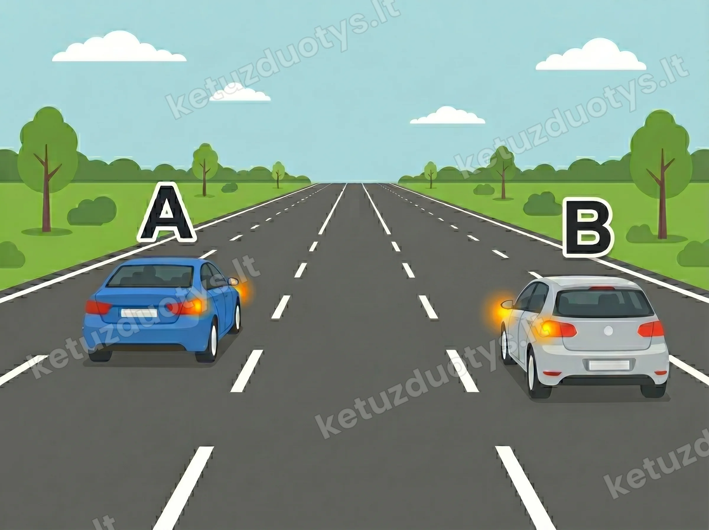 Jūs važiuojate automobiliu A ir norite persirikiuoti į gretimą juostą. Tuo pačiu metu ta juosta važiuojantis automobilis B taip pat persirikiuoja į tą pačią juostą. Kas kam turi duoti kelią?