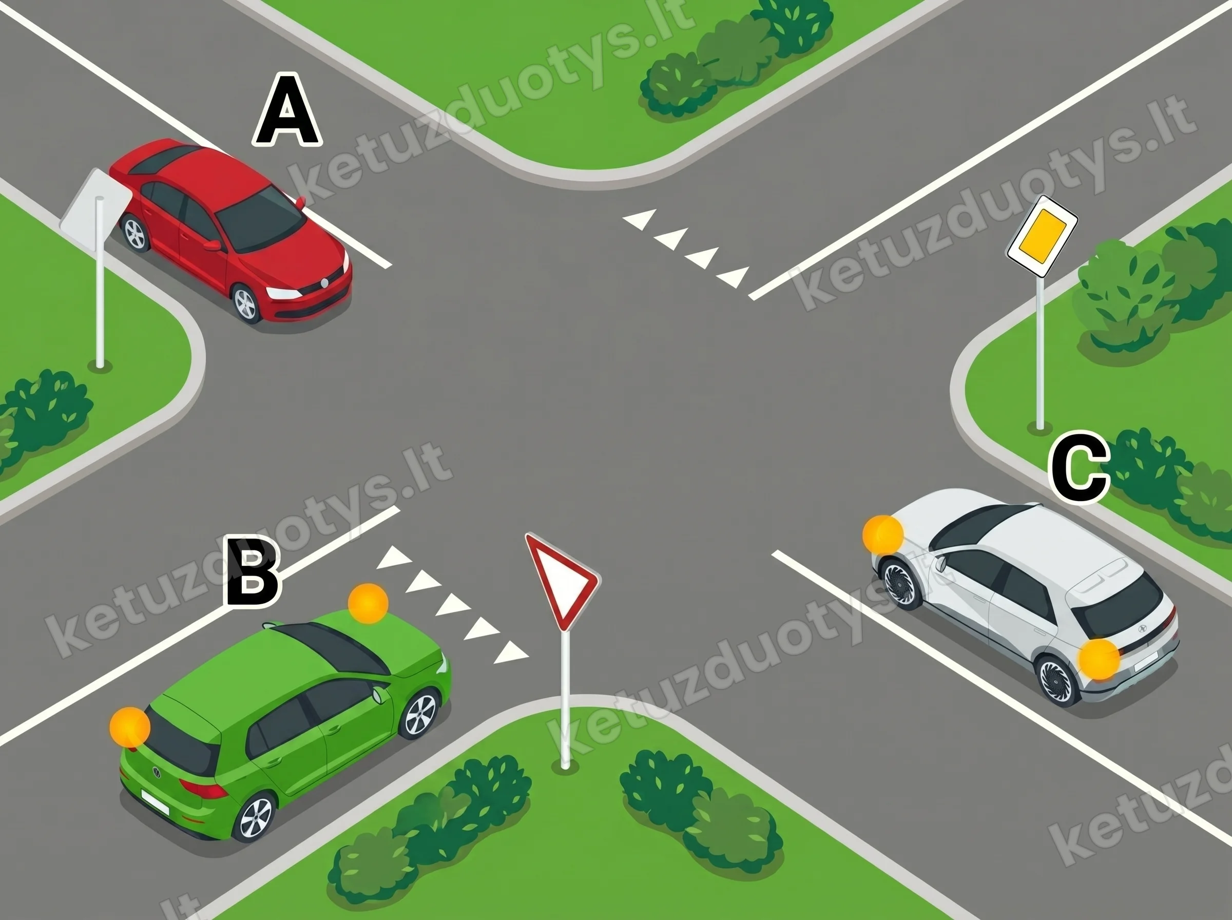 Jūs važiuojate automobiliu A. Artėjate prie sankryžos, kurioje pagrindinis kelias suka į dešinę. Jūs ketinate važiuoti tiesiai. Iš dešinės pagrindiniu keliu atvažiuoja automobilis B. Kas turi pirmumą?