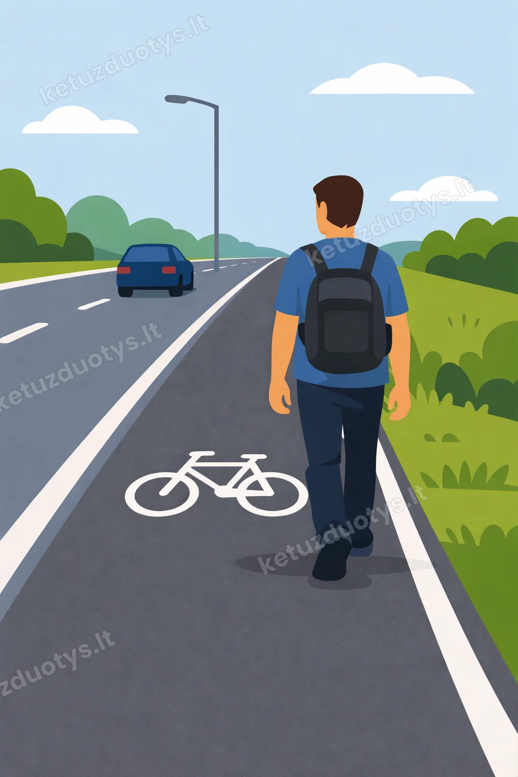 KET nuoroda: KET 48.5: Pėstiesiems draudžiama judėti dviračių takais, išskyrus atvejus, kai reikia pereiti į kitą dviračių tako pusę arba kai kelyje nėra šaligatvio ar pėsčiųjų tako ir šiais atvejais nebus trukdoma dviratininkų eismui.