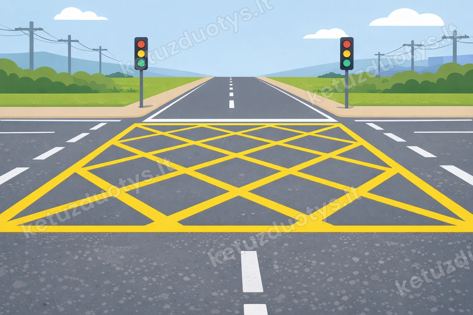KET nuoroda: KET 3 priedas 1.32: Geltonomis linijomis pažymėtas plotas važiuojamųjų dalių sankirtoje žymi vietą, į kurią įvažiuoti draudžiama, jeigu joje ar už jos yra kliūtis, kuri priverstų vairuotoją sustoti važiuojamųjų dalių sankirtoje ir trukdyti kitų transporto priemonių eismui.